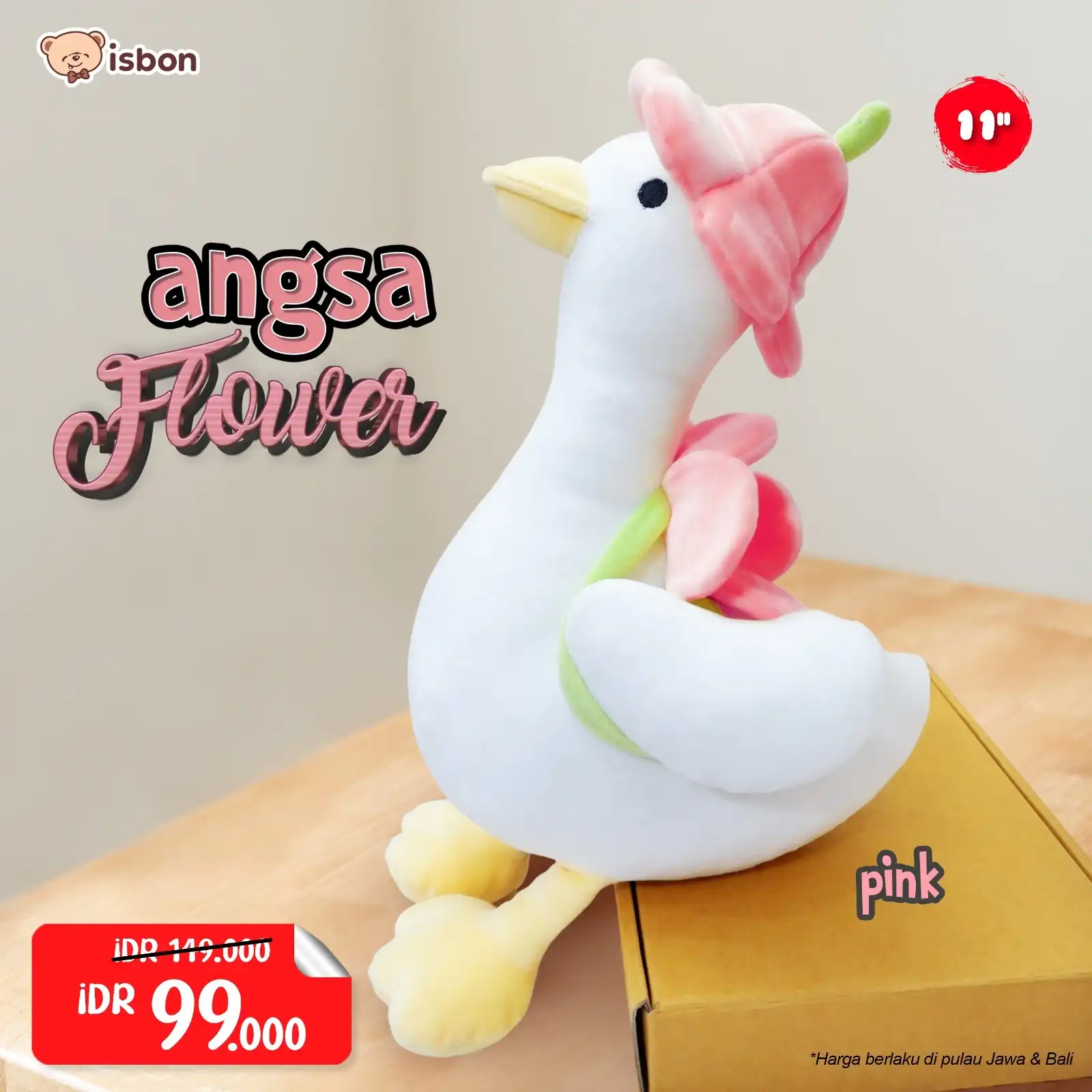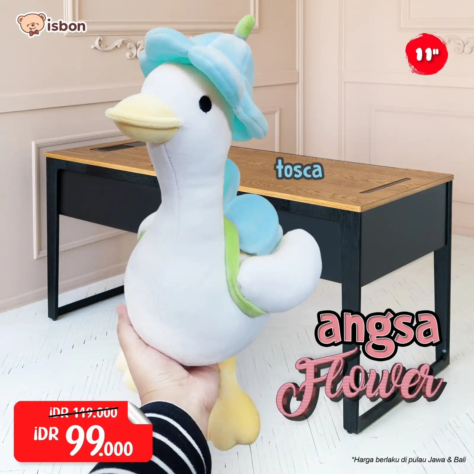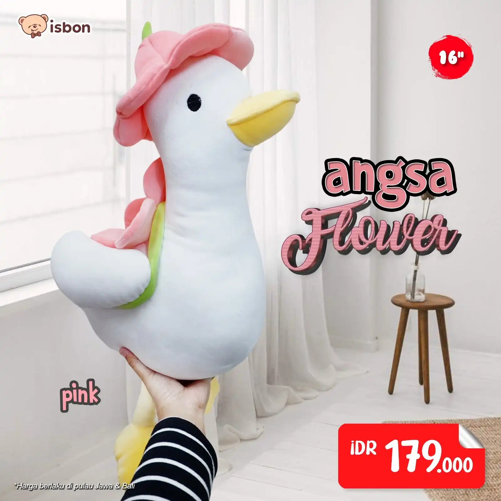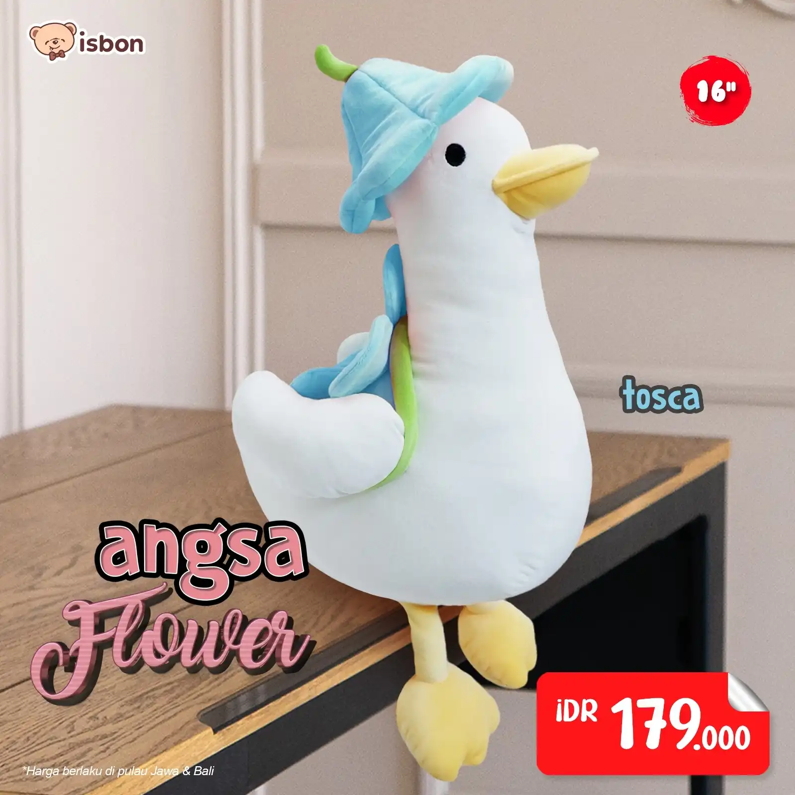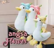 Boneka dengan karakter hewan angsa dengan tambahan bunga dikepala dan dibagian punggung, boneka ini nyaman dipeluk saat tidur, lembut dan halus.
