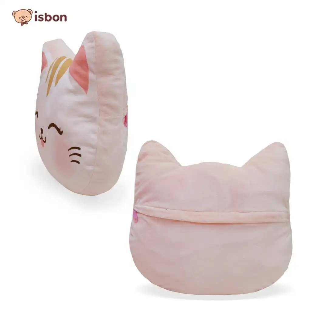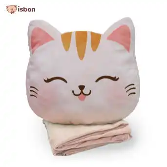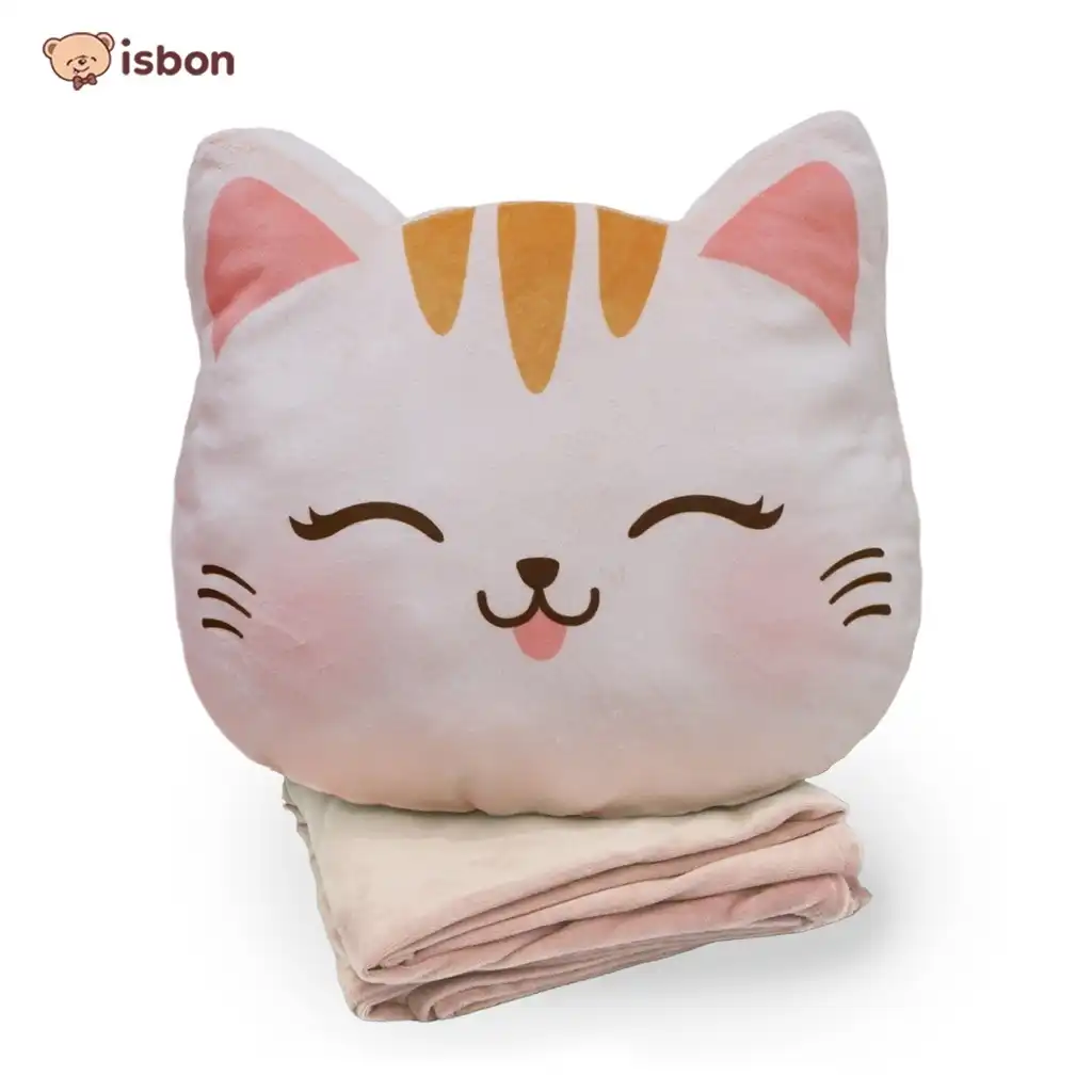 Balmut bantal selimut dengan karakter kucing dengan warna peach dan ekpresi wajah yang lucu sangat mudah dibawa saat berpergian jauh atau traveling,dengan bahan yang lembut dan hangat,non alergi dan aman digunakan untuk anak anak.