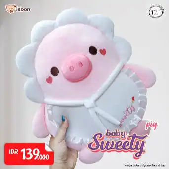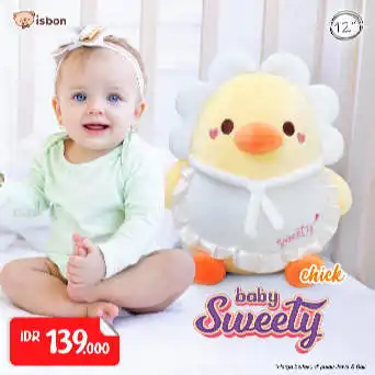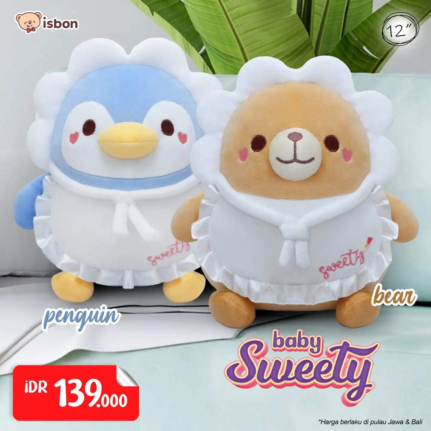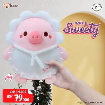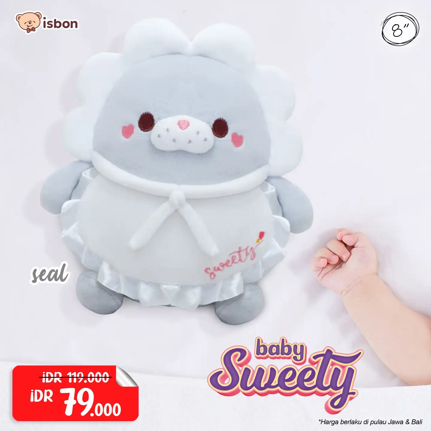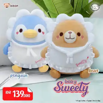 Boneka bayi karakter hewan yang lucu, memakai pakaian bayi warna putih, dengan badan yang mungil menjadikan boneka ini semakin lucu dan imut.