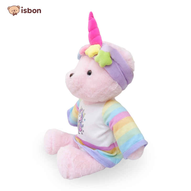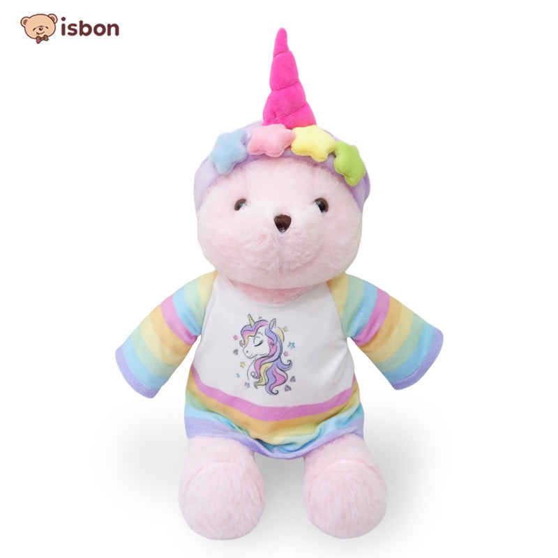Boneka bear beruang dengan warna tubuh pink dan tambahan asesoris bando tanduk unicron warna warni dibagian kepala boneka,boneka ini menggunakan pakaian dengan warna pelangi sehingga sangat lucu dan menggemaskan,cocok untuk mainan anak dan hadiah.