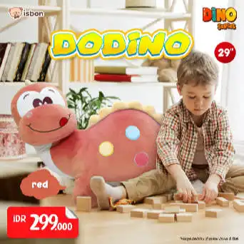 Boneka dinosaurus dodino berwarna merah dan hijau sangat lucu, bahan lembut dan sangat cocok untuk hadiah/kado.
