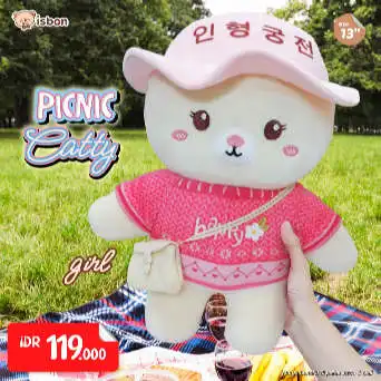 Boneka dengan karakter kucing dengan tambahan baju spesial picnic, berbahan lembut dan lucu, cocok untuk hadiah ulang tahun anak.