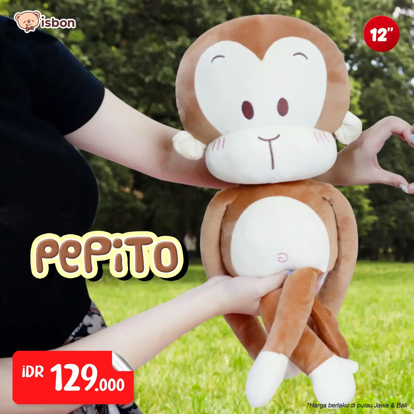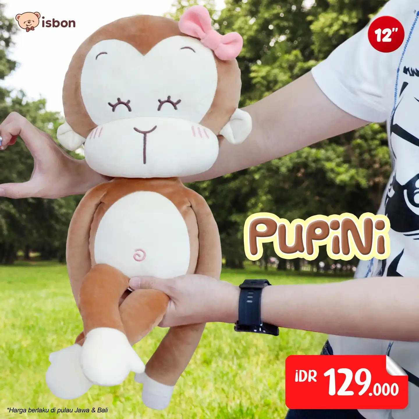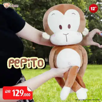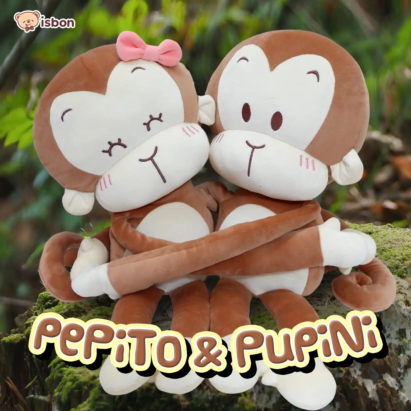 Boneka dengan karakter binatang monyet atau pepito dan pupini, boneka ini memiliki panjang tubuh sekitar 30 cm dan memiliki warna tubuh brown dengan ekspresi yang lucu dan menggemaskan boneka ini cocok untuk mainan anak dan hadiah, bahan halus dan lembut non alergi,