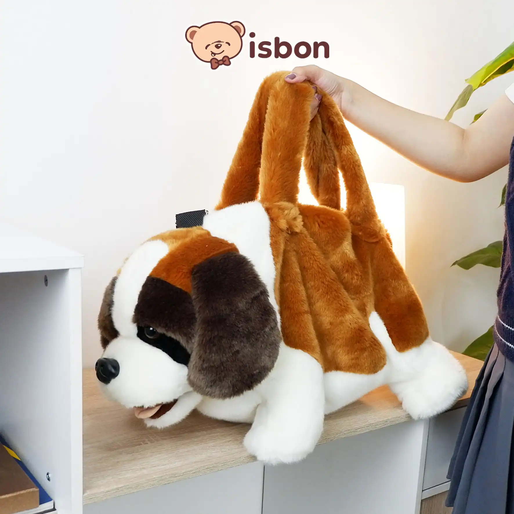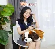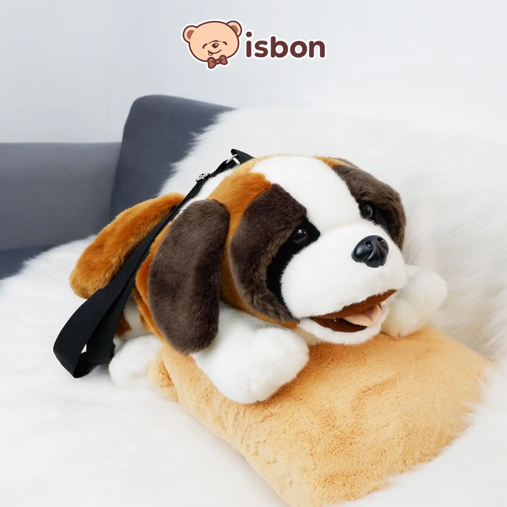 selempang karakter anjing dengan bulu halus warna cokelat, terdapat kapasitas