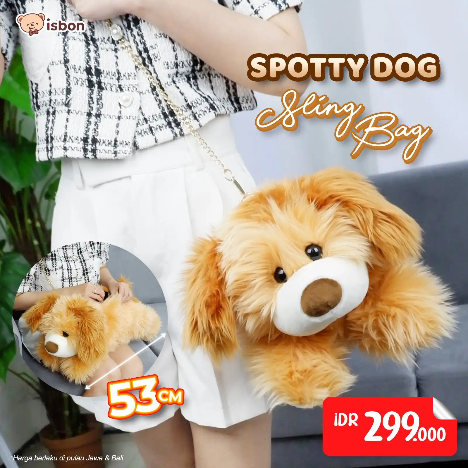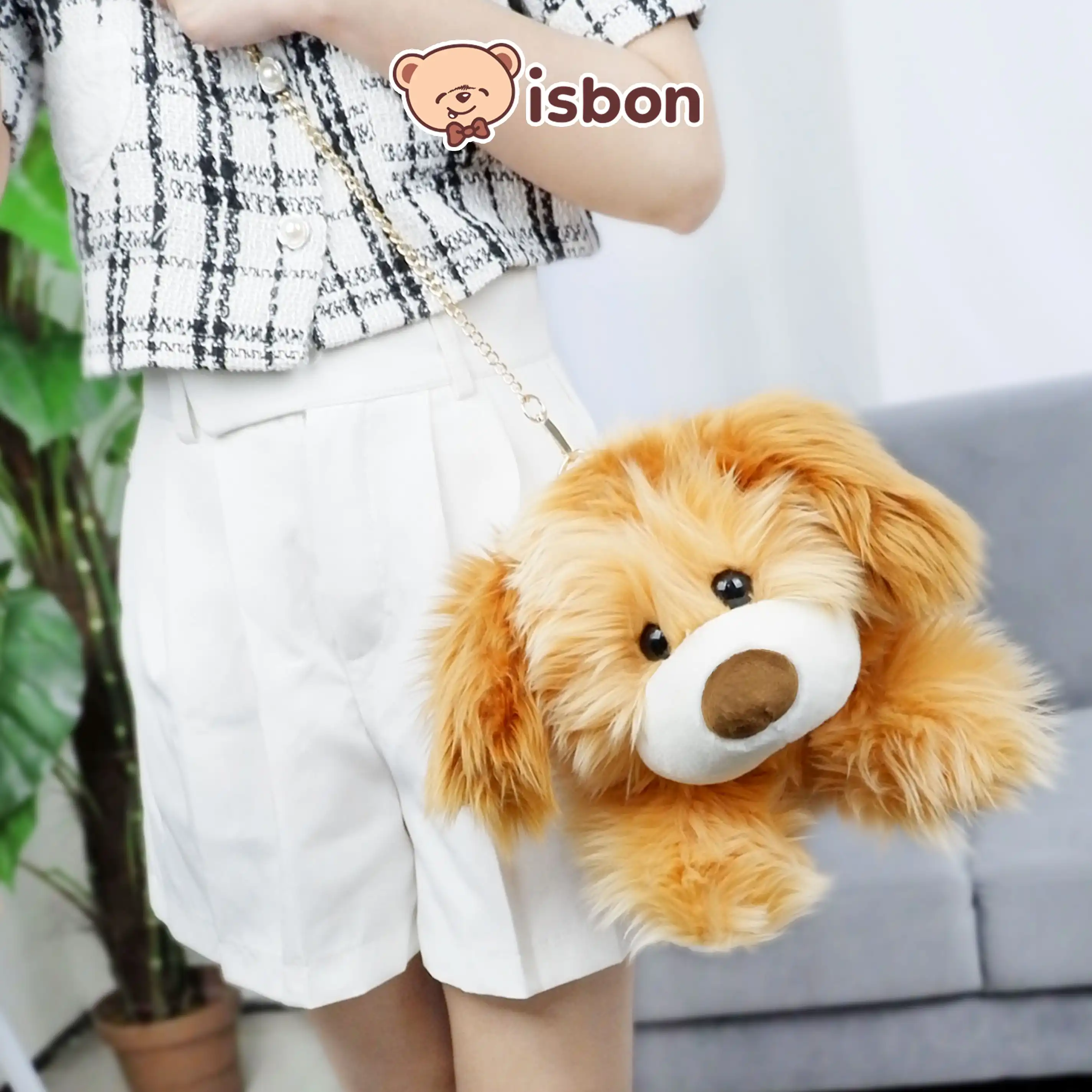 Boneka tas selempang karakter anjing dengan bulu halus warna cokelat, terdapat kapasitas untuk menaruh barang didalamnya, bahan anti alergi sehingga aman untuk anak-anak dan bayi